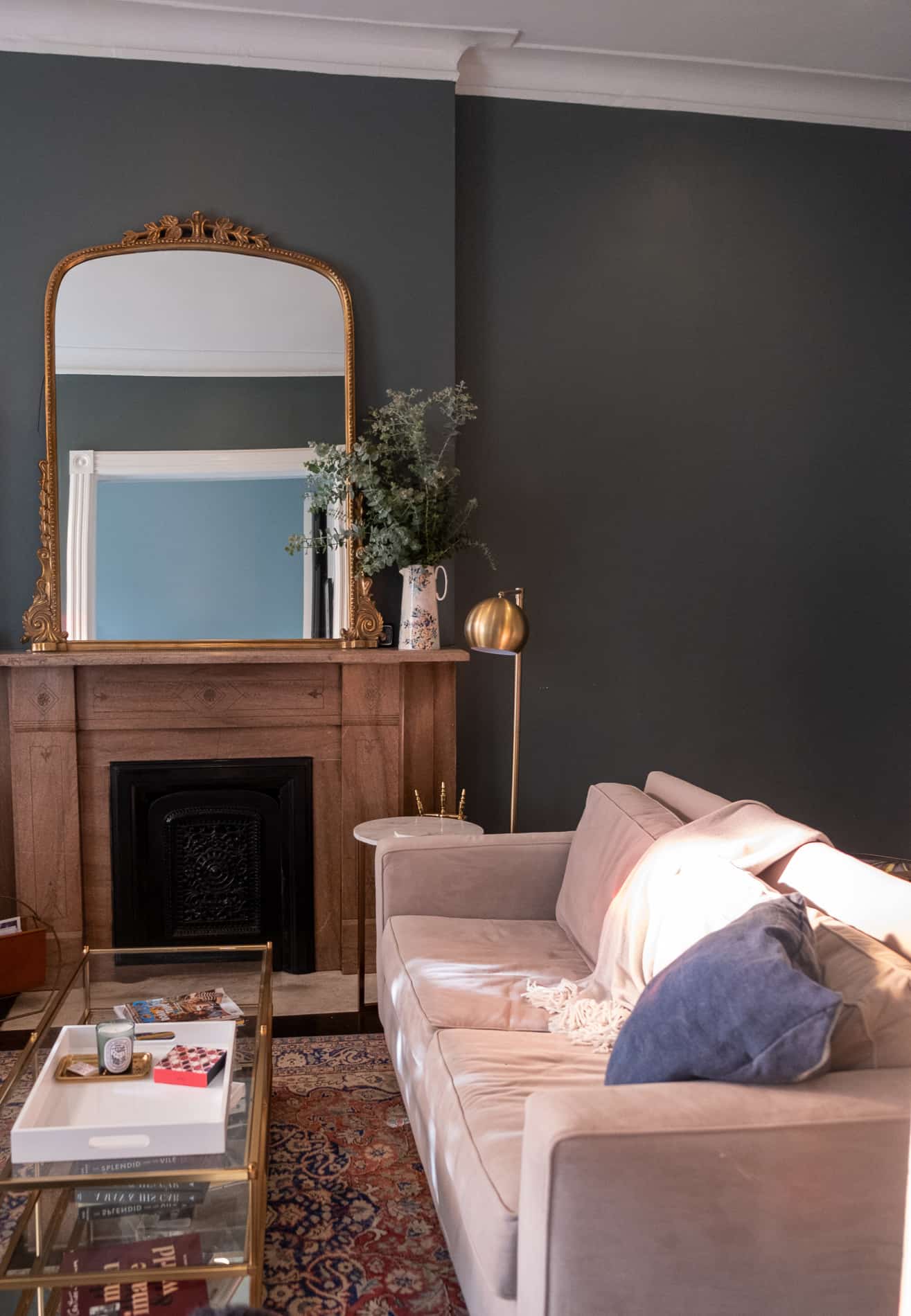You can add a fresh coat of paint to the walls to change your entire space. A new color is an inexpensive way to update the look of a room. We love the Homburg Grey color, which looks more green than grey and has warmed up the living room. Recently, we added some furniture with warm tones to complete the space.