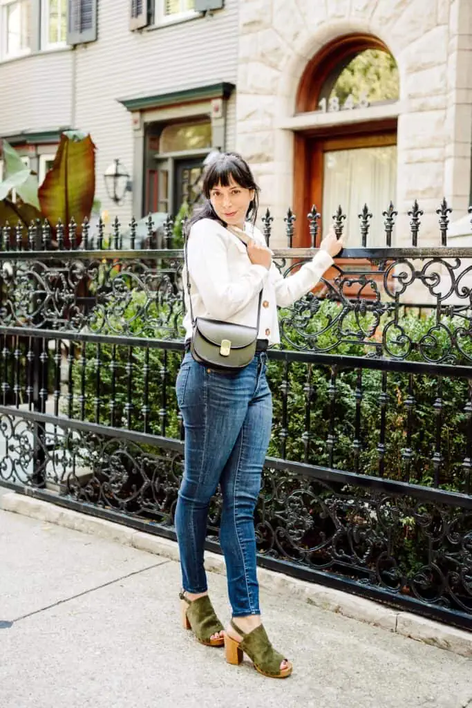 Dress up the bag for a night out with a skirt or dress. It also works excellent as a crossbody bag to run errands with a pair of jeans and sneakers for a walk with Henri. It is just the right size to hold everything I need. I am wearing the Sézane Will jacket, a perfect fall transition piece.