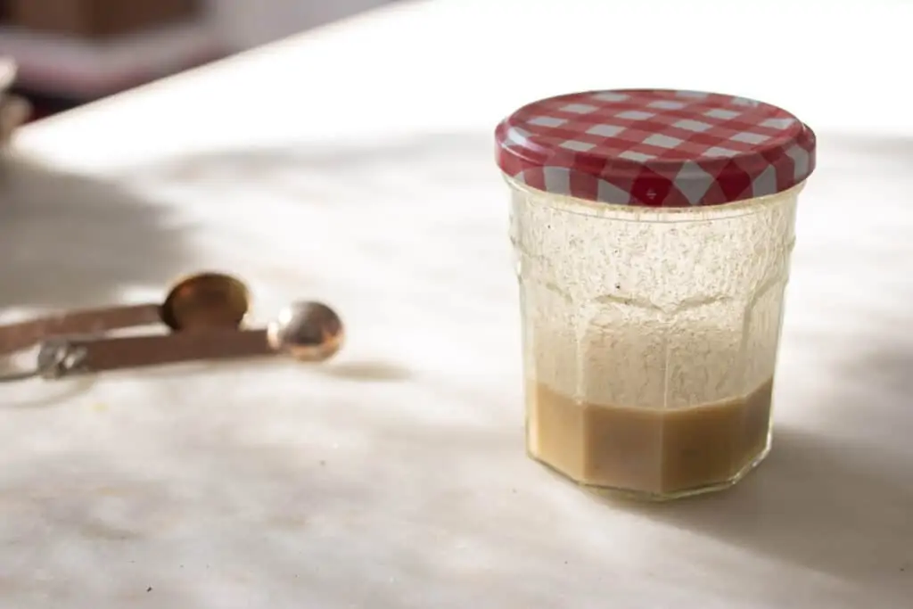 You can make it in a bowl with a whisk, and you can also make it in an old Bonne Maman jar. This is great for storage to keep in the fridge if you make a little more than you need. This is great to have on hand to throw on mixed greens.